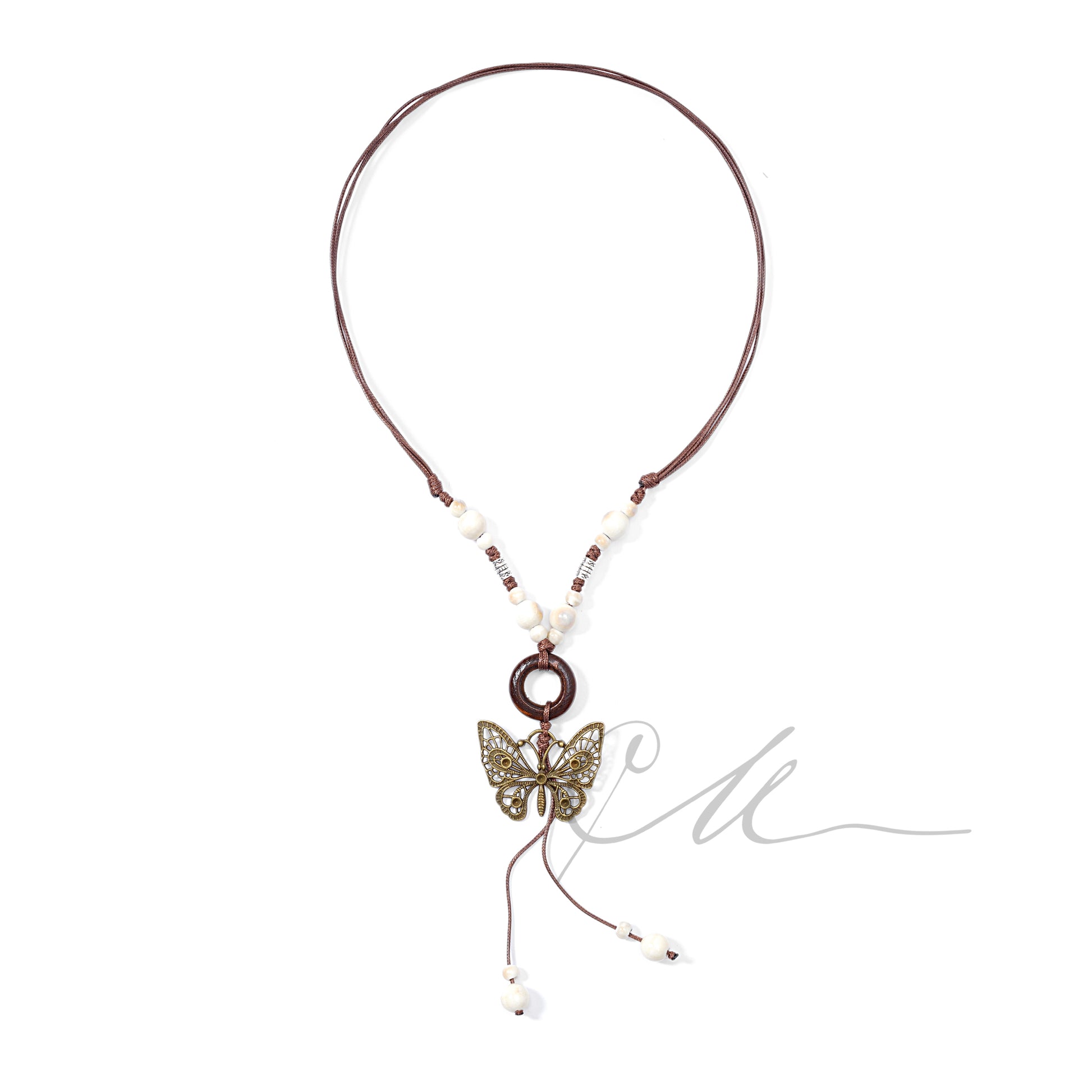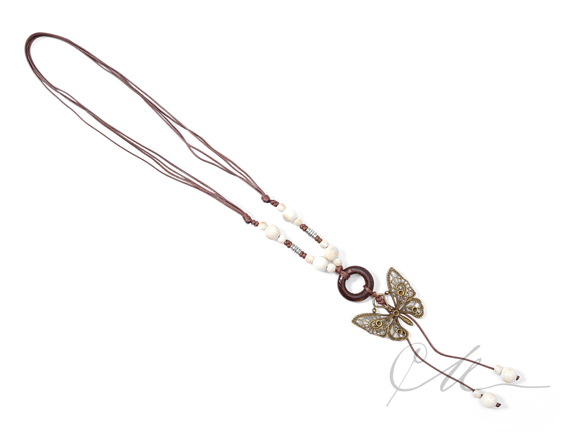 Featuring a detailed bronze-toned butterfly pendant framed by a wooden ring, this necklace captures a grounded elegance. The warm brown cord is accented with cream-toned ceramic beads, evoking dried blossoms and summer dusk.