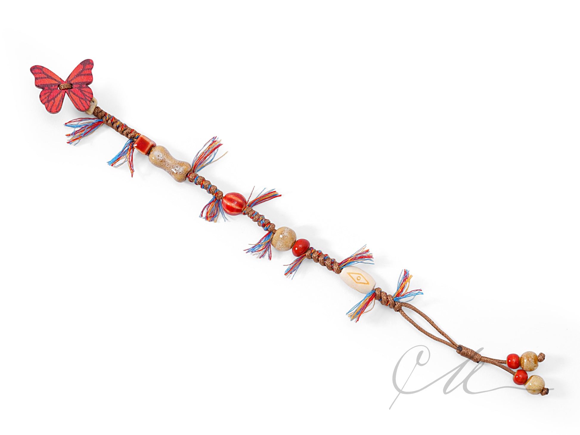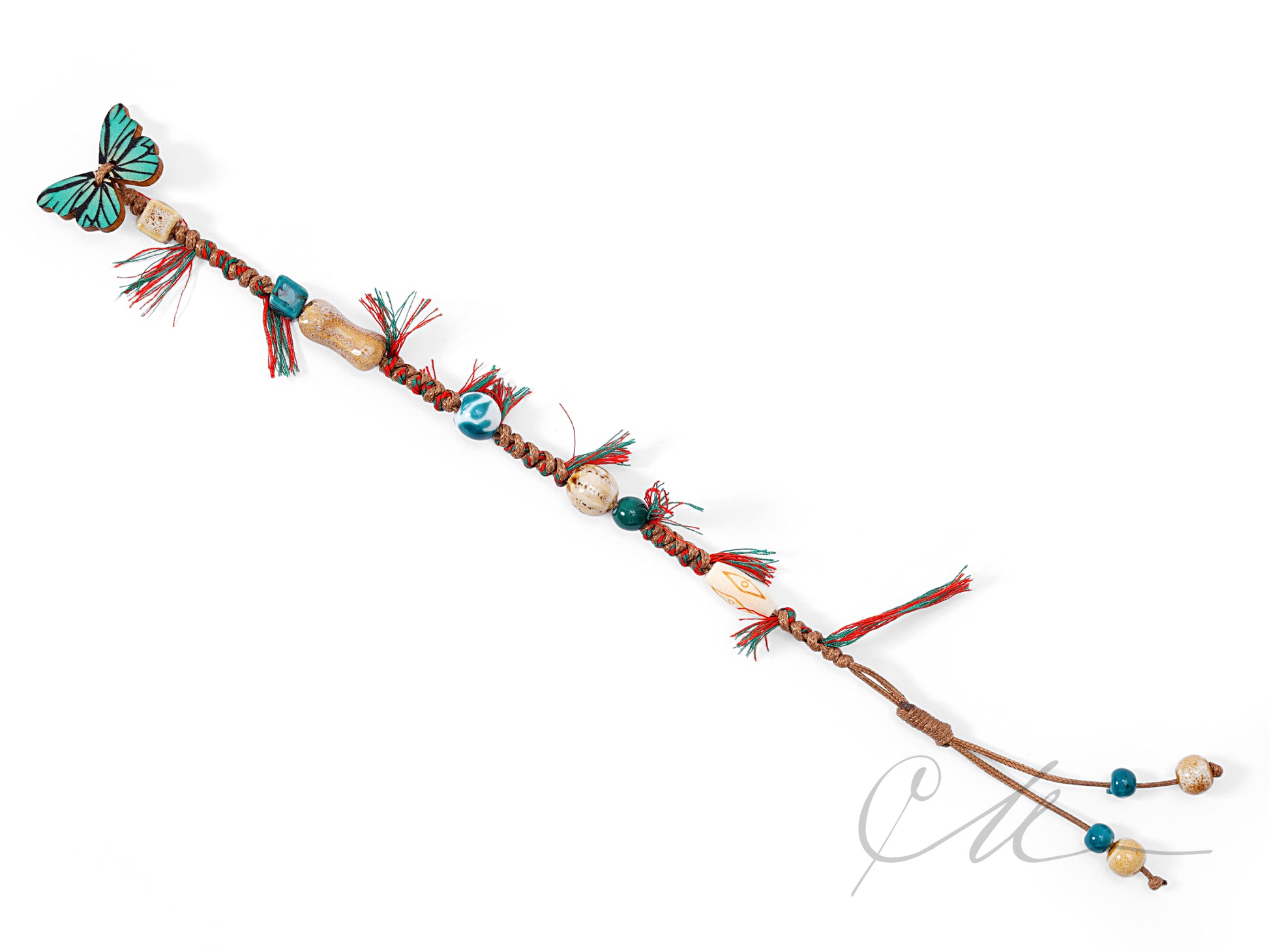 Crafted using traditional Tibetan knotting techniques, each piece is carefully woven with durable cord, adorned with ceramic beads that shimmer like morning dew, and finished with a wooden butterfly charm in your choice of blue, green, or red — each color reflecting a different whisper of the wild.