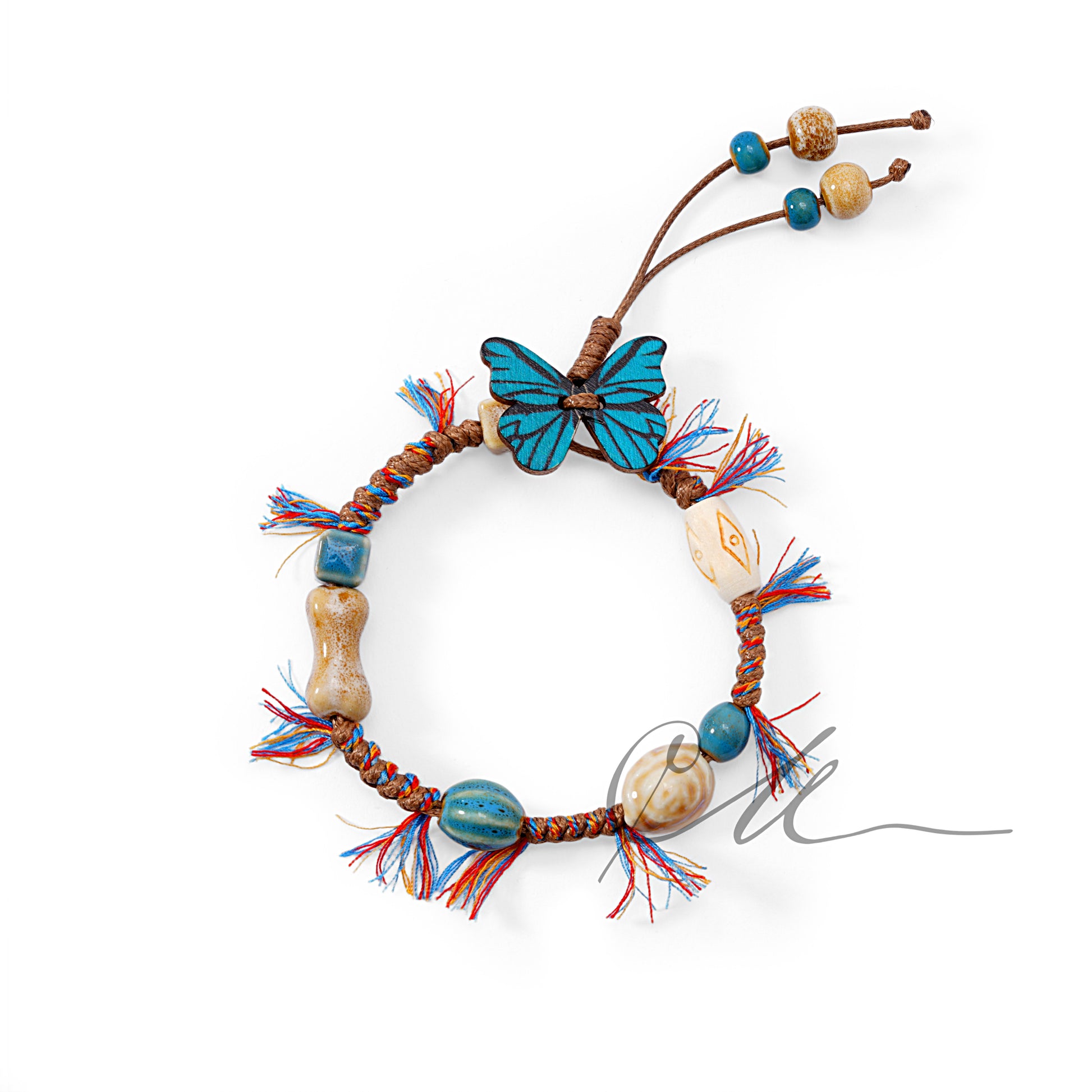 Butterfly Whispers – Ceramic Bead Handwoven Bracelet with Wooden Butterfly Charm