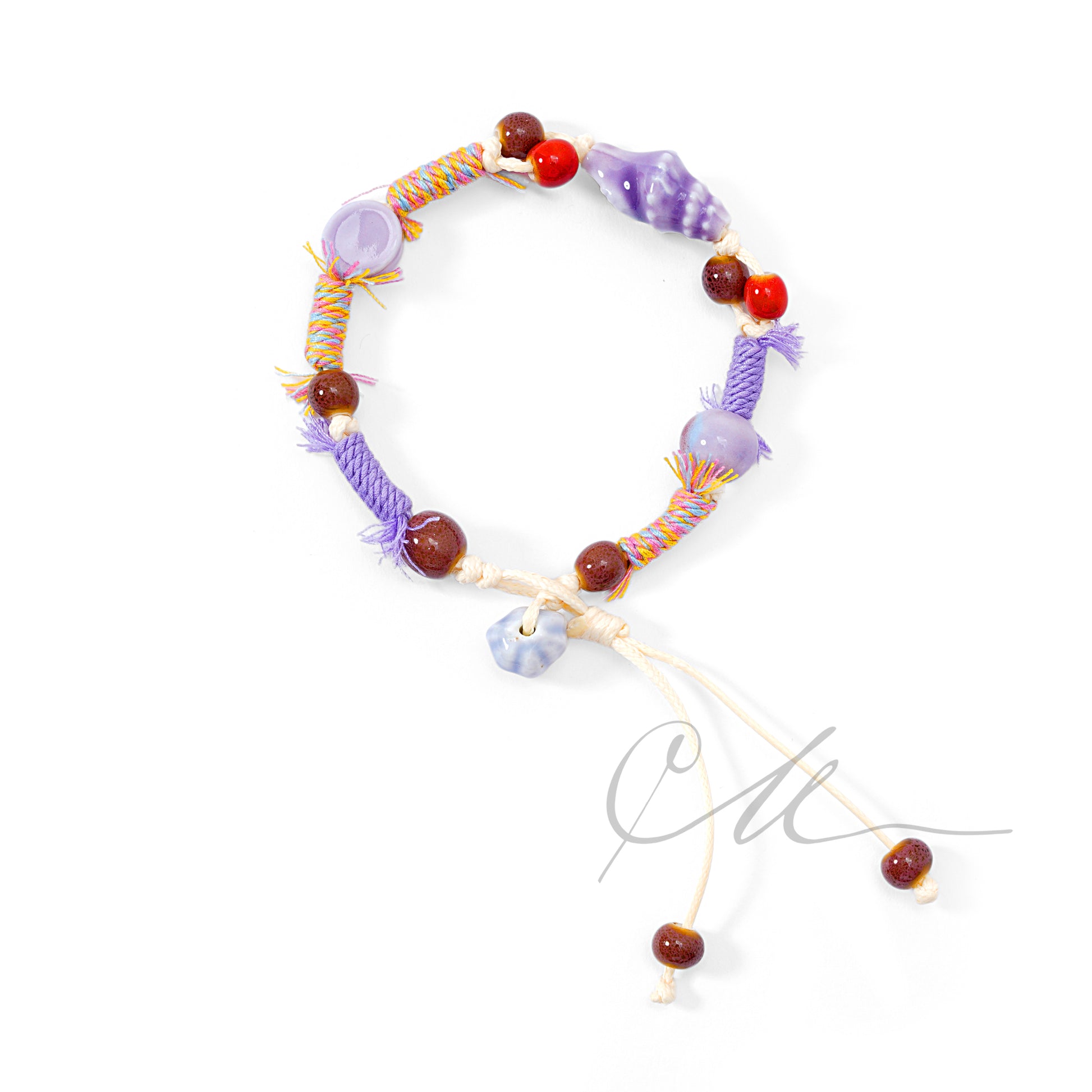 This bracelet centers around a ceramic conch bead glazed in a dreamy lilac hue β a quiet, ocean-born form that feels both grounded and free. The Tibetan-style hand-braided cord flows around it like gentle waves, adding texture and calm movement to your wrist.