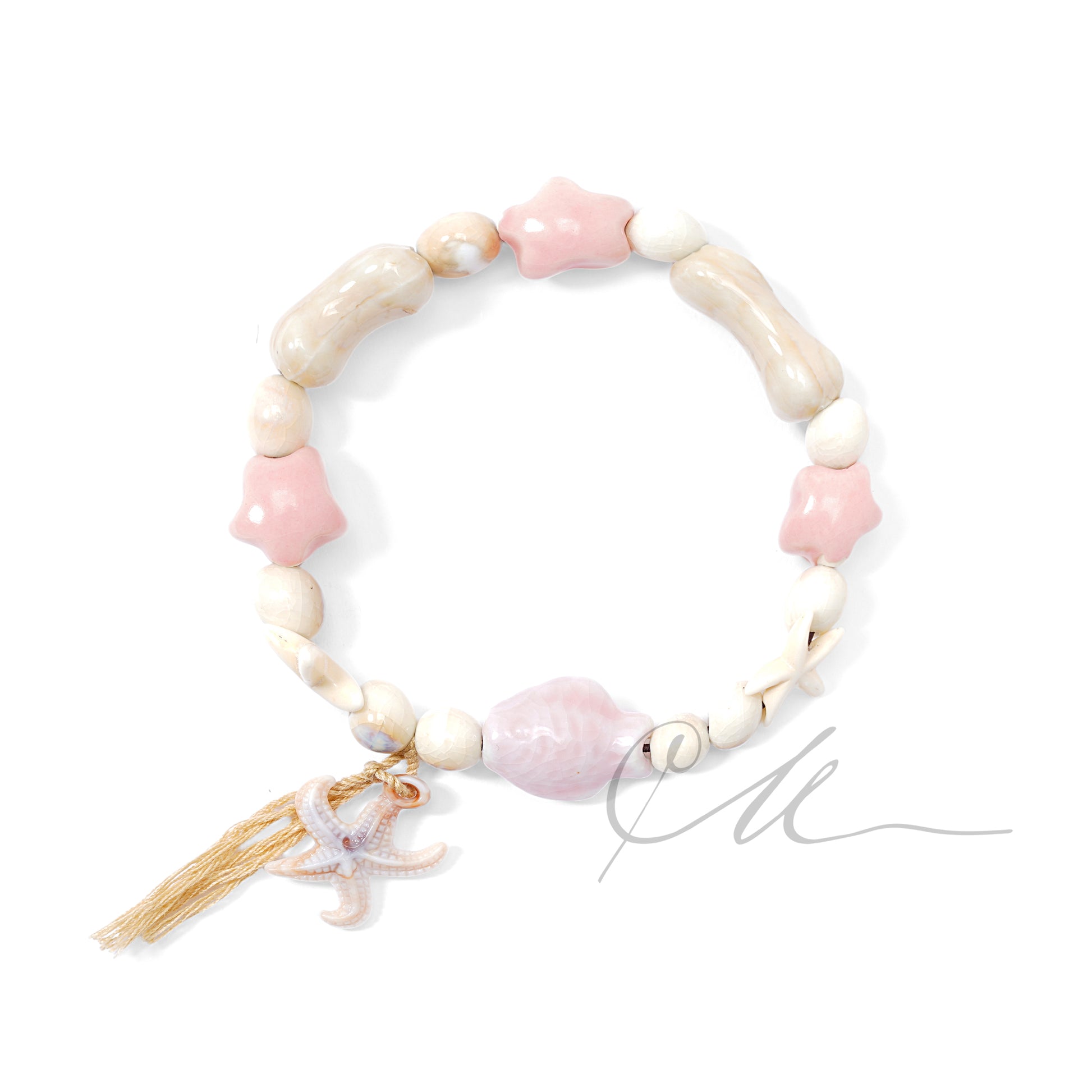 With a pink ceramic fish, a soft five-pointed star, and a tiny sea star charm, Nalu is a delicate tribute to tides, shells, and quiet seaside mornings. Each ceramic bead is glazed with subtle variations, giving the piece its own handmade rhythm.