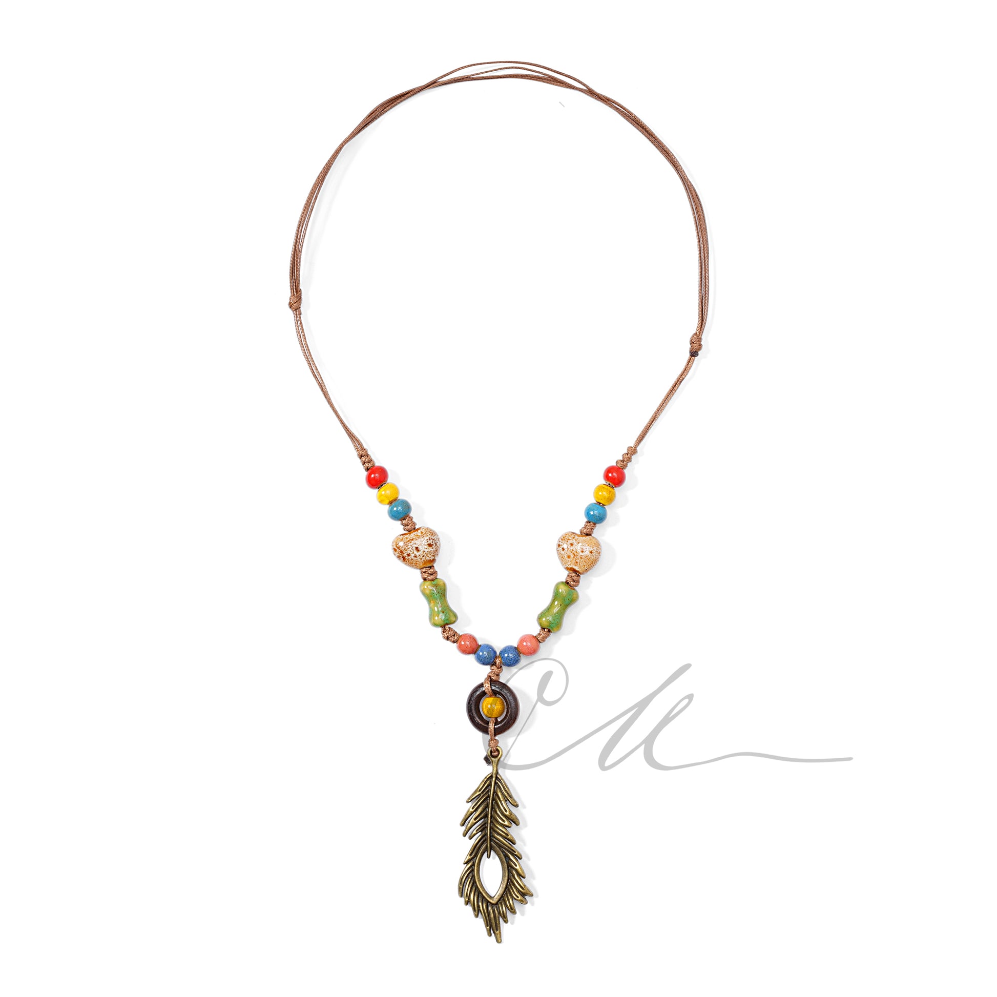 This handcrafted necklace features hand-glazed ceramic beads in rich desert tones: saffron orange, jade green, cobalt blue, and deep coral. Two wooden bear-shaped accents add a playful earthiness, while the centerpiece β a vintage-style peacock feather charm suspended from a ceramic ring β brings symbolic strength and renewal.